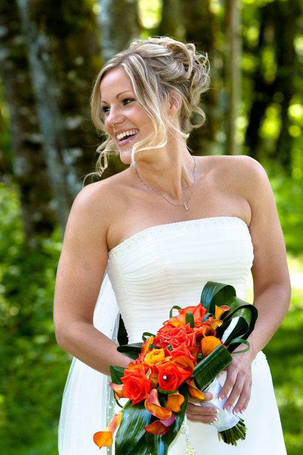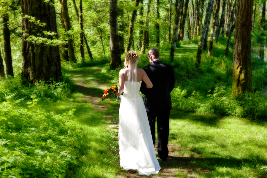 I always like to include a collection of images of the bride’s bouquet. This one was taken at Bridal Veil Lakes, about an hour east of Portland. There are many ways to do this and one of my favorite is to have the groom stand behind the bride and have them both clasp the bouquet together. I then frame the image so only their hands (with rings!) and the flowers are showing, with a little bit of wedding dress and tuxedo in the background. Whenever I start this sequence I always tell the couple they can relax their faces, since I’m only focusing on their hands. I happened to look up during this particular shot and saw very nice, unguarded expressions on both their faces. No time for fill flash, or to adjust my metering for the bright sky behind them, but I got the shot. They loved it!