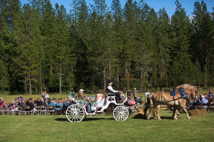 I love when a bride (or groom!) makes a grand entrance. At this wedding, near the town of Lebanon, Oregon, the bride elected to arrive via horse drawn carriage. Perfect!