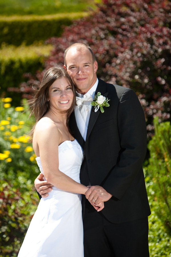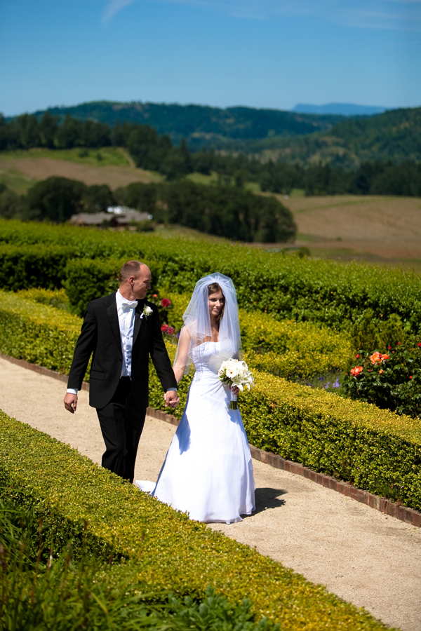 Most of the weddings I’ve shot at King Estate have been at the Pavilion area. One of the nice things about King Estate weddings, however, is that every couple who gets married there has full access to all parts of the venue. Bryce and Shannon definitely took advantage of that. We traipsed all over the place, starting in front of the great wooden doors. I thought I’d start them off in a shady area so as not to wear them out too fast in the hot sun. Even though it was a busy Saturday, with wine tours coming and going, we had the upper garden area all to ourselves. What a view! It was the perfect time of year to walk the garden paths: everything was in bloom and there was a nice breeze to keep Shannon’s veil in motion. I’m fairly adept at getting people to loosen up in front of the camera and soon had Bryce and Shannon perfectly at ease. It also helped that I was using a long lens and some OCF (off-camera flash) so they wouldn’t feel like they were being hounded by paparazzi. Long lenses are also great for compressing distances and King Estate has some wonderful vistas to take advantage of in that manner. There’s also a wonderfully cool barrel room and Bryce wasted no time in moving the forklift out of the way for me, so I could get the perspective I wanted. Nice to have a groom who knows how to operate a forklift:)