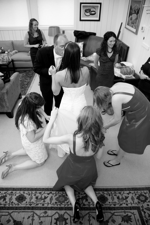 When I first started shooting weddings on my own, back in 2004, I secretly prayed for cloudy days. I didn’t know much about OCF back then, and really liked how forgiving a bright cloudy day could be. That was then, this is now. However, there are still some instances where cloudy days make the scene much more dramatic, as is the case in the image below. This was at Julie & Nate’s wedding and, just after this image was taken, the skies opened up and everyone had to dash inside.