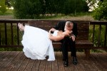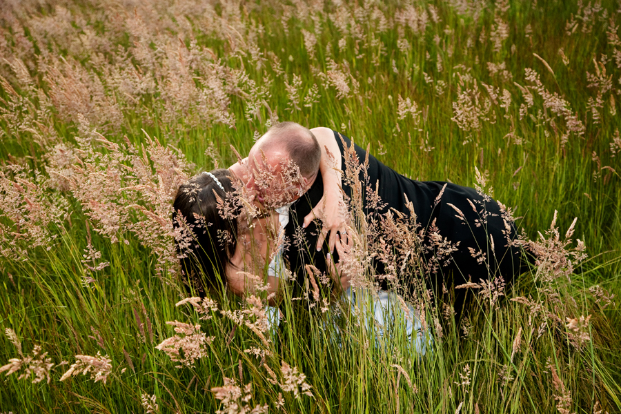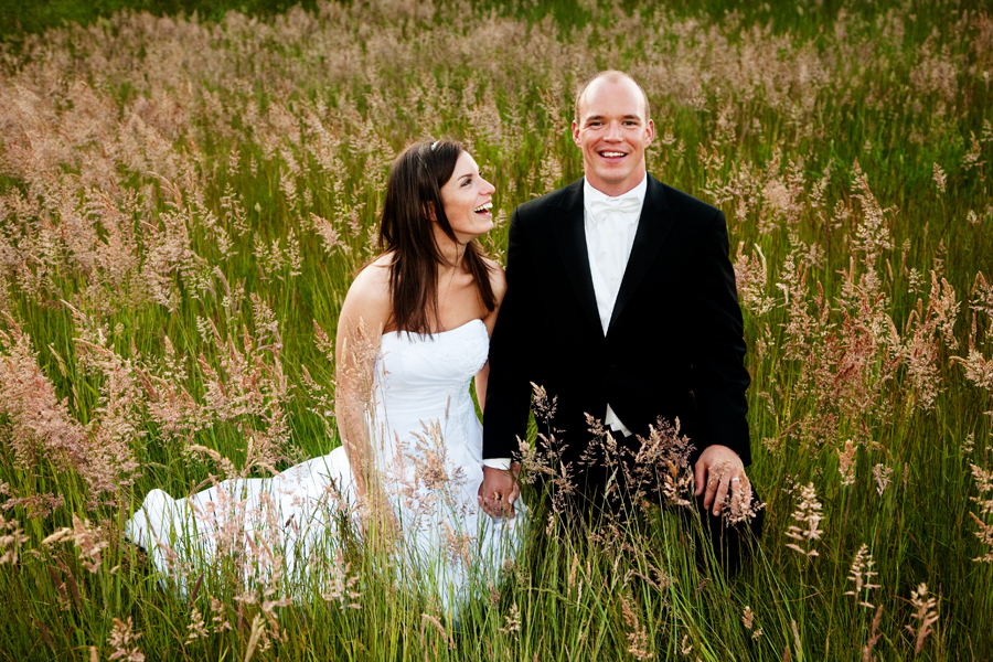 Bryce and Shannon wanted to keep the family and wedding party shots to a minimum so they could spend more time with each other. I had no problem with that but suggested we wait until a little later in the evening to visit the pond area, and the tall grass that surrounds it. To loosen them up a little I had them play the Kissing Game, in which Bryce and Shannon took turns trying to kiss each one another’s ear while the other tried their best to resist. They got a slightly carried away and ended up in the grass…