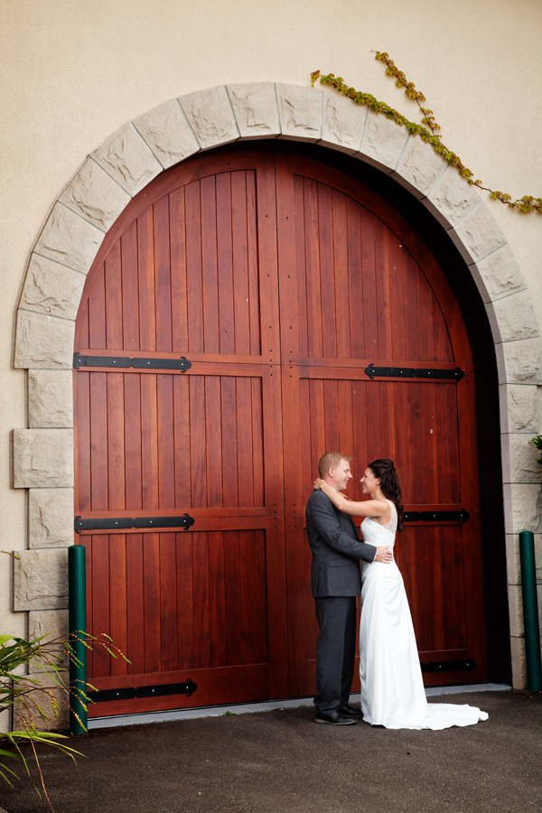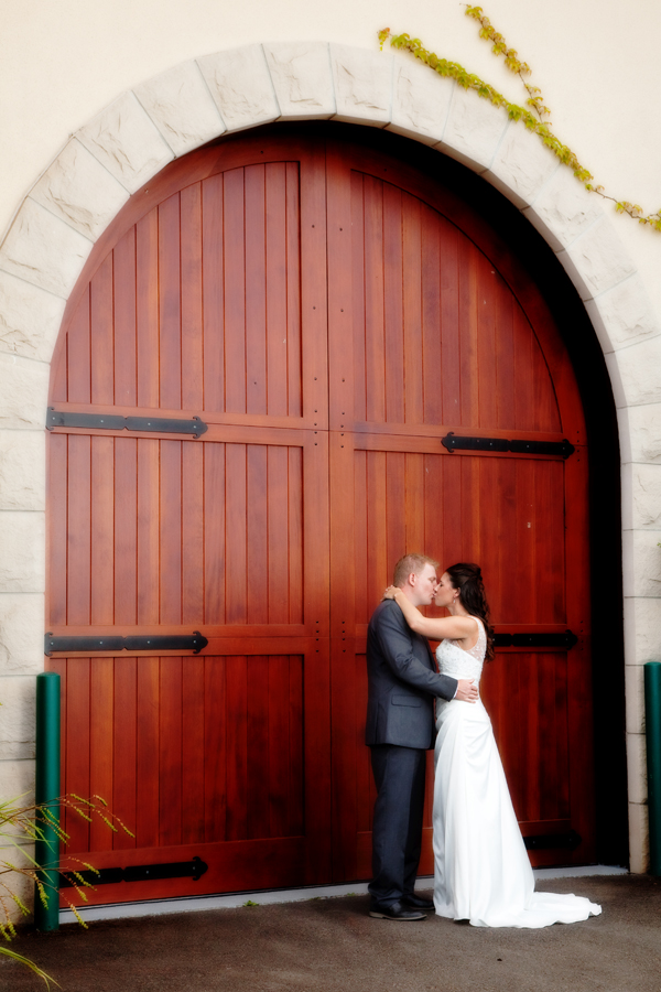 Finding good location for couples portraits is important, since it’s normally these images that are most often ordered as prints. If I’m shooting at a venue for the first time I like to scout out some possible locations beforehand so I’m not trying to figure that out during the frenetic pace of a typical wedding day. Since I’ve shot a dozen or so weddings at King Estate over the years, finding locations there is easy! I particularly like these big wooden doors; they seem like something from an old castle. This set of doors is doubly nice because the location is always in full shade during the early afternoon; the couple doesn’t get overheated nor are they squinting into the sun. I love shots in full sunshine, too, but these doors work better without any direct light hitting them. I did use an off-camera flash, softened behind a 46″ umbrella, to light up the couple a bit, but I dialed it down to 1/64th power so as not to blow out the soft image I was looking to create.