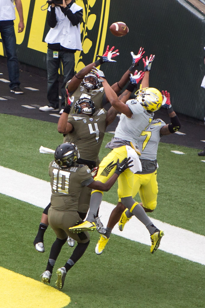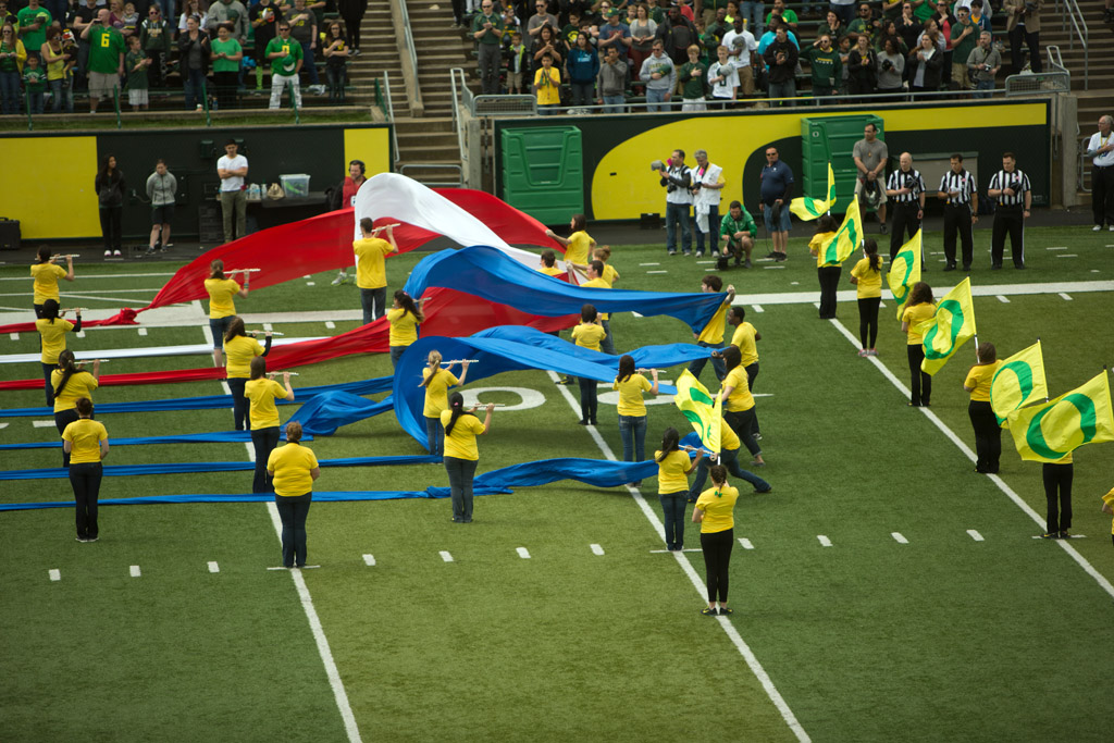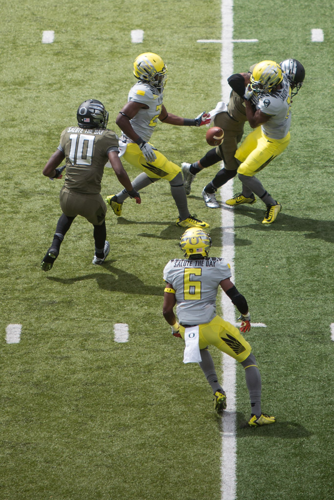 While these images aren’t exactly wedding related, they do show what a perfect union can achieve. These were all taken at Autzen Stadium today, in optimal football weather. Former Ducks starting point guard, Jonathan Lloyd, has made the jump over to the gridiron and he got rocked on his first attempt at returning a punt. After the play was over the stadium announcer said “Welcome to football, Jonathan Lloyd.” Only in a scrimmage game would one expect to hear the announcer directly addressing a player on the field, during the game. The Ducks’ first-team offense looked great, as expected, and the crowd of 25k people cheered them on.