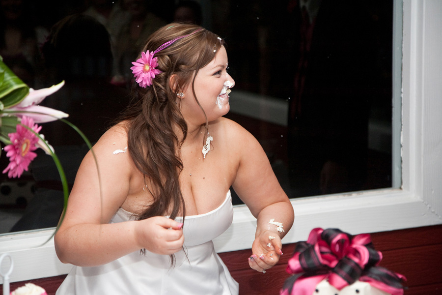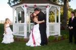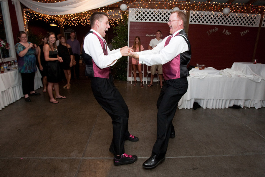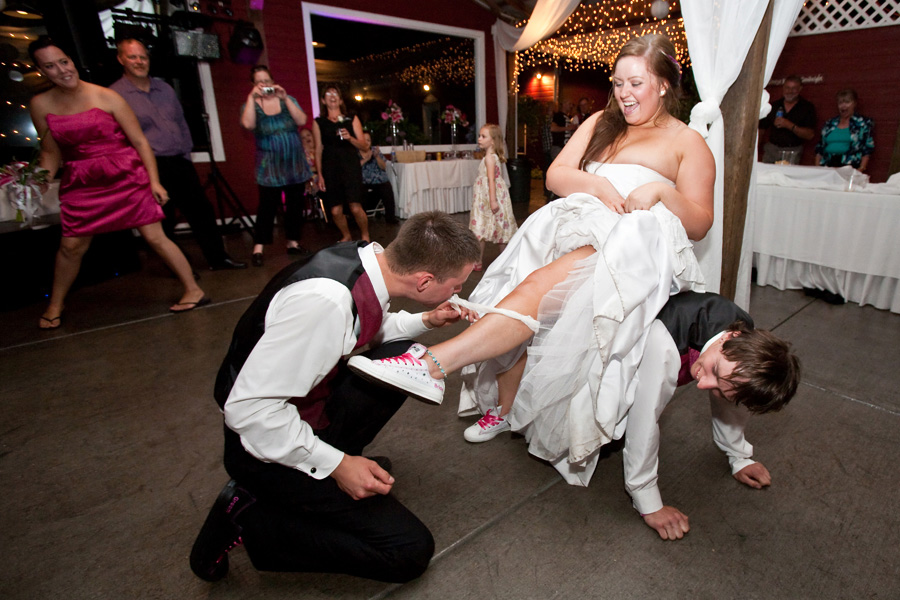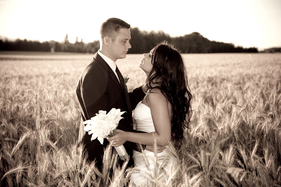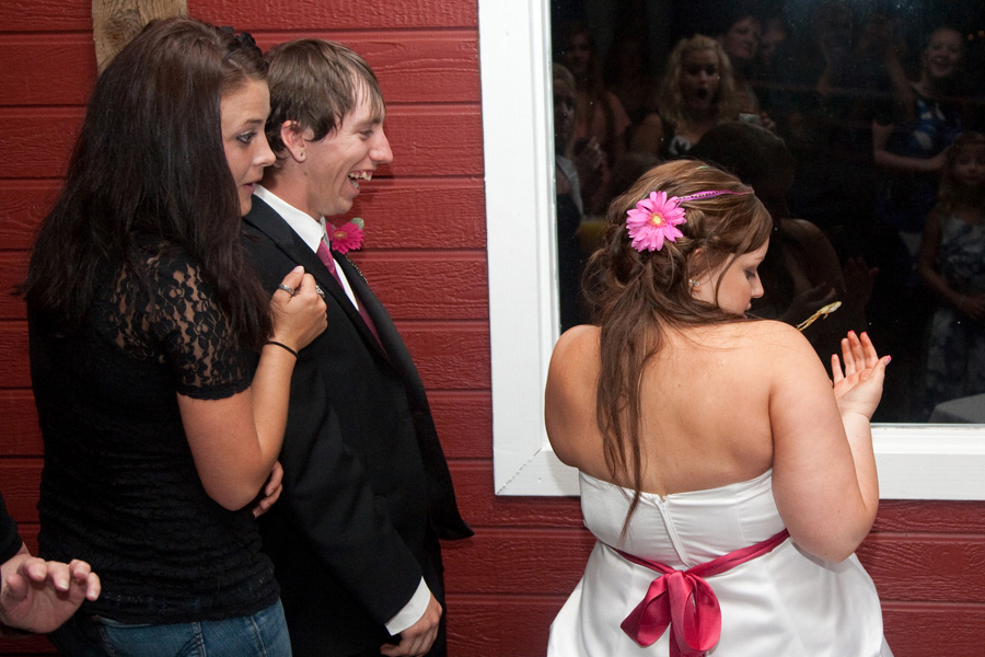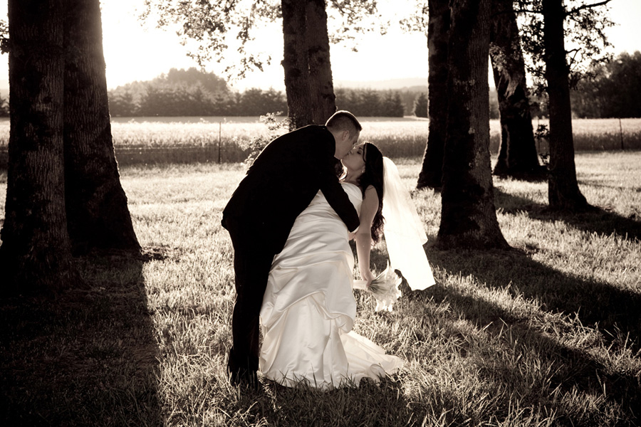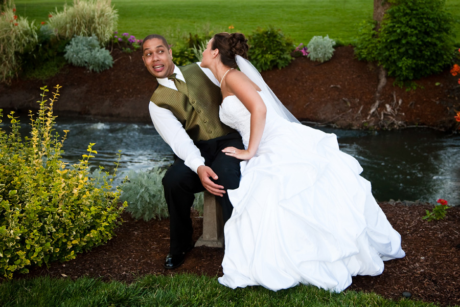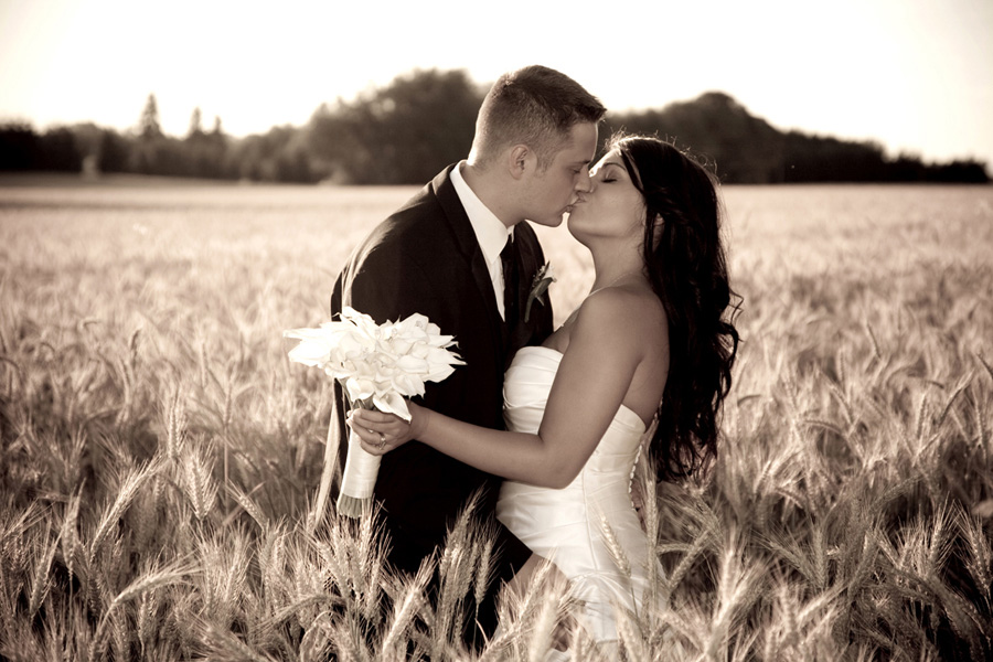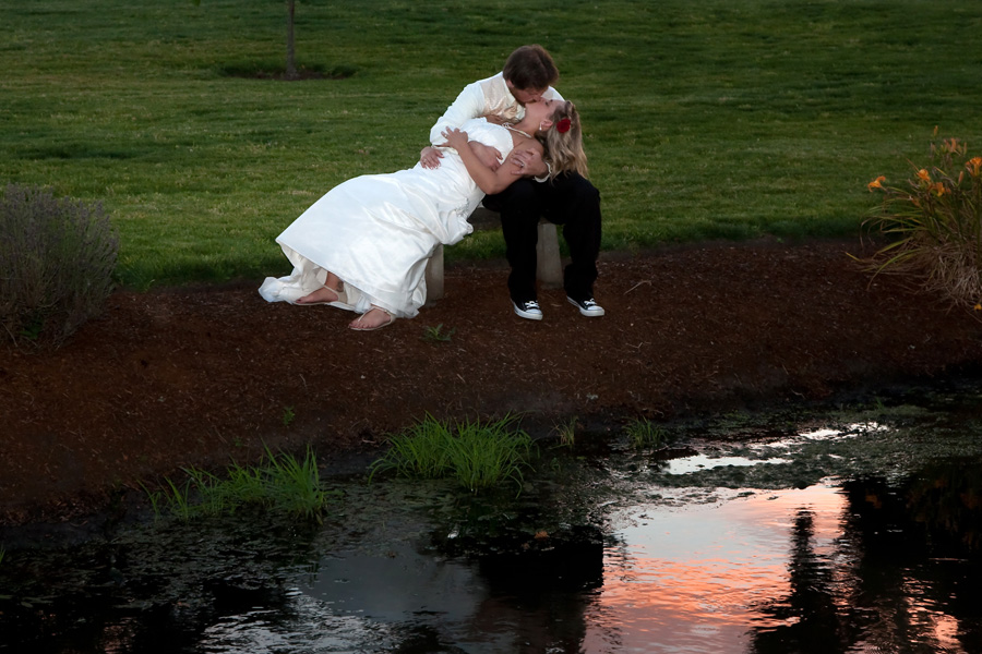 Bryce and Shannon wanted to keep the family and wedding party shots to a minimum so they could spend more time with each other. I had no problem with that but suggested we wait until a little later in the evening to visit the pond area, and the tall grass that surrounds it. To loosen them up a little I had them play the Kissing Game, in which Bryce and Shannon took turns trying to kiss each one another’s ear while the other tried their best to resist. They got a slightly carried away and ended up in the grass…